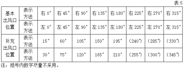 分進風口與(yǔ)出風口兩種,按葉輪旋轉方向區(qū)別,右(左)出風口角(jiǎo)度/進風口角度。基本出風口位置為八個,特殊用途可增加補充其表示方(fāng)法和原有代(dài)號見表(5)、基本進風口位置為五個:0°、45°、90°、135°、180°,特殊用途例外,若不裝進氣室的風機,則進風口位置可不予(yǔ)表示,風(fēng)口位置的寫法是:右(左)出風(fēng)口角度。