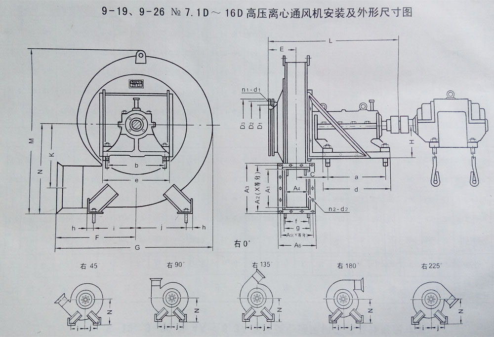 9-26高壓離心(xīn)鼓風機(jī)屬於單吸入式,通常有9-26 4A、4.5A、5A、5.6A、6.3A、7.1D、8D、9D、10D、11.2D、12.5D、14D、16D共13個機(jī)號。 出(chū)口位置以機殼的出口角度表示(shì)。“左”、“右”均可製成0度、45度、90度、135度、180度、225度共六種角度。